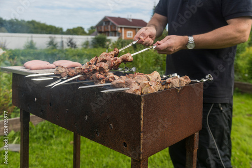 a man on a summer day cooks meat on skewers in the courtyard of a country house.