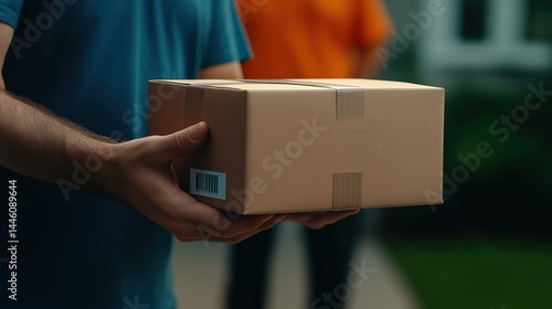 A man receiving cardboard boxes from a delivery person at home, with the focus on the hands and packaging, and a blurred background.