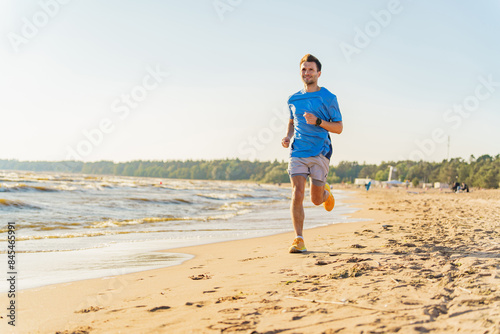 A man runs along a sunny beach near the waves, wearing a blue shirt and bright shoes, smiling as he jogs.