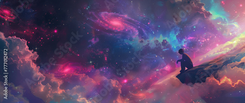 A man sits on the ground in space, surrounded by colorful galaxies and stars, with dreamy clouds floating around him