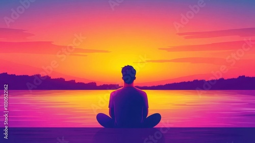 A man sits peacefully on the shore of a tranquil lake at sunrise, deeply engaged in the moment as the sun rises above the horizon