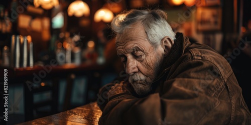 A man sitting at a bar with his head resting on a table. Suitable for restaurant or alcohol-related concepts