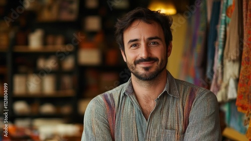 A Man Smiling in a Shop with Shelves and Fabric