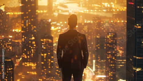 A man standing on top of a tall building. Suitable for concepts like success, achievement, urban lifestyle, and overcoming challenges