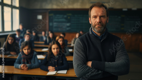 A man stands confidently in front of a classroom of students