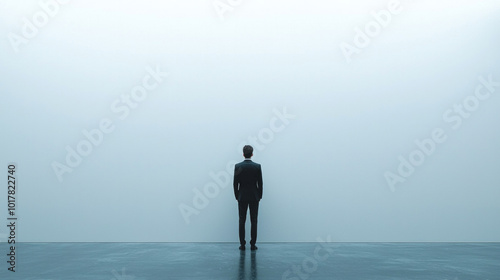 A man stands in front of a wall, looking out into the distance