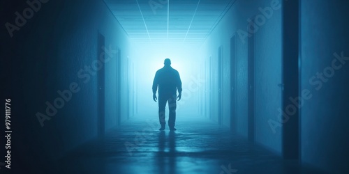 A man stands in the dark corridor of an old, abandoned hospital, with fog and light shining from behind him