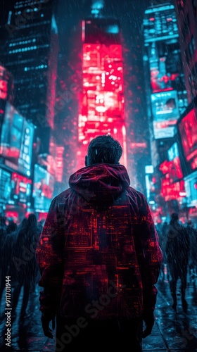 A man stands in the rain in front of a tall building. The image is a digital art piece with a futuristic cityscape in the background. The man is wearing a red jacket and he is looking up at the sky