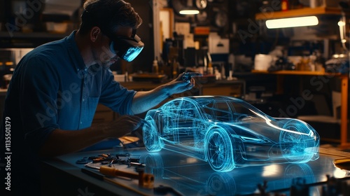 A man using vr technology to design a holographic electric car in a modern workshop setting