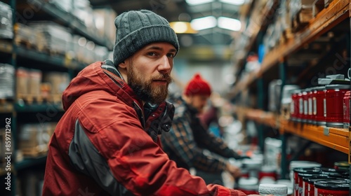 A man wearing a grey beanie hat and a red jacket is seen shopping in a large warehouse store, surrounded by shelves filled with various products and a fellow shopper nearby.