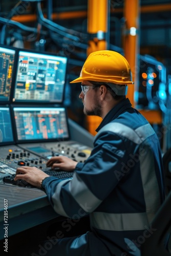 A man wearing a hard hat is focused on his computer screen. This image can be used to depict a worker in a construction or industrial setting