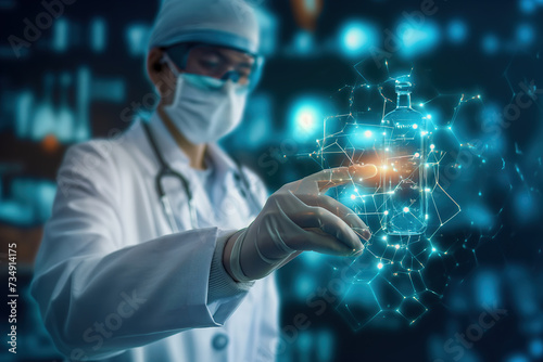 A man wearing a white lab coat and face mask engages with a virtual interface.