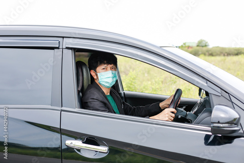 A man wearing a work suit drives a sedan to work in the city. wearing a medical mask to prevent infection during the coronavirus epidemic The driver of the sedan wears a mask for Covid-19.