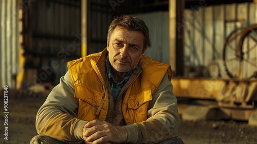 A man, wearing a yellow vest, poses in front of a warehouse and looks straight into the camera.