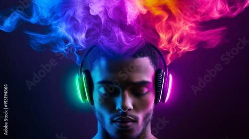 A man wearing headphones is looking at the camera. The image is colorful and has a futuristic vibe