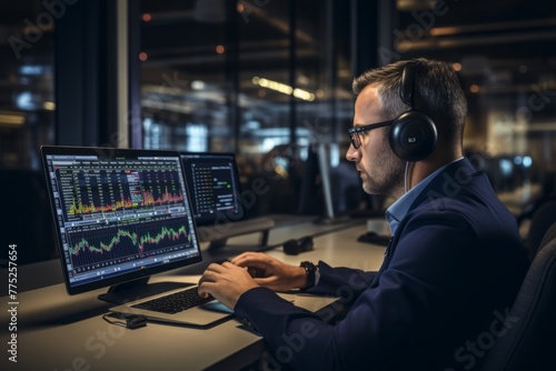 A man wearing headphones is seated in front of a computer screen, focused on analyzing performance metrics for a call center. He appears engaged in enhancing productivity and efficiency