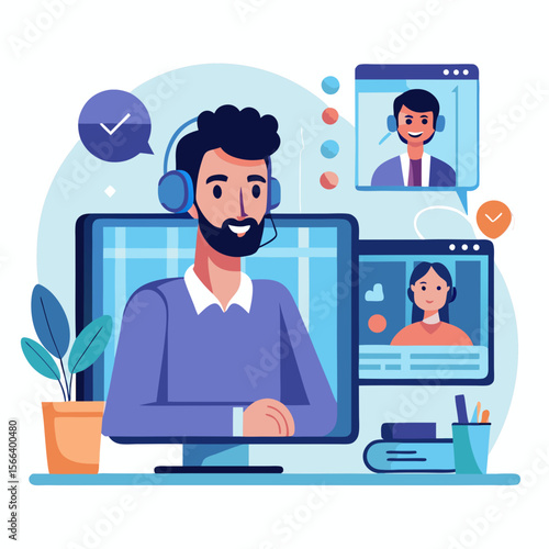 A man wearing headphones is talking to two people on a computer screen. The man is smiling and the two people are smiling back. Concept of connection and communication between the people on the screen