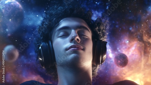 A man wearing headphones, with his eyes closed, floating peacefully in space. His expression is calm and relaxed, as if he's lost in the music.