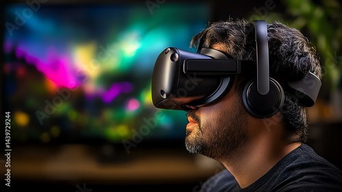 A man wearing virtual reality headset immersed in an engaging digital world.