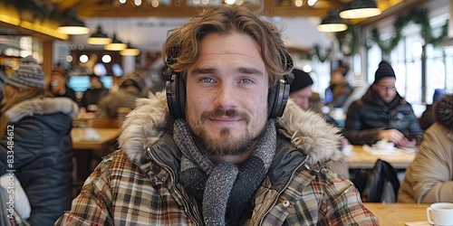A man with a beard and a scarf is sitting at a table in a restaurant