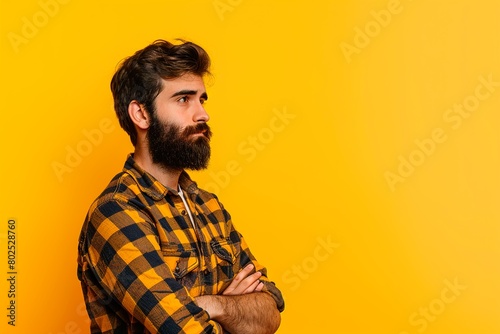 A man with a beard and plaid shirt is standing in front of a yellow wall