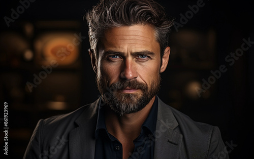 A man with a beard is photographed in a dark studio setting. He is wearing a gray suit and black shirt and is looking directly at the camera with a serious expression