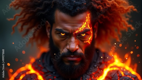 a man with a black beard and a fire in the hearth with his eyes open, his whole body in burning magma