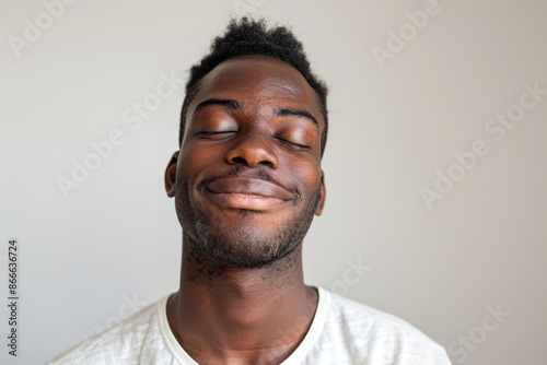 A man with a relaxed smile and closed eyes, completely isolated from the environment, set against a plain white background