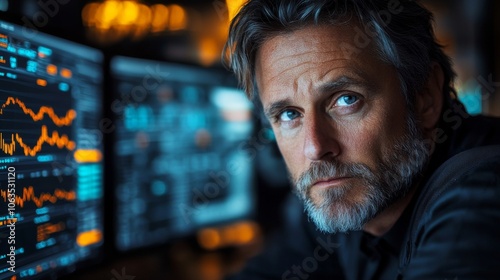 A man with a thoughtful expression examines financial graphs and data on several screens in a dark office. The light from the monitors highlights his features.