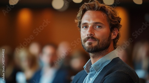 A Man With Curly Hair and a Beard Listens Intently During a Conference in a Well-Lit Meeting Room Filled With Engaged Attendees in the Background