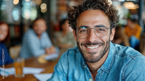 A man with curly hair and glasses, dressed casually, smiles warmly at the camera, indicating a relaxed and happy atmosphere, with people blurred in the background.