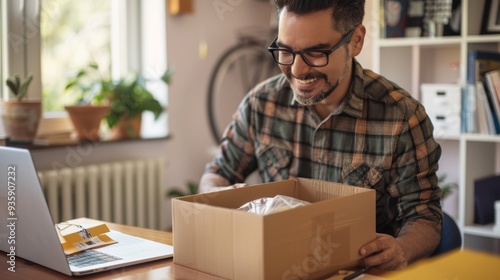A man with glasses and a beard smiles as he opens a cardboard box, likely receiving a package at home, with an office setup in the background.