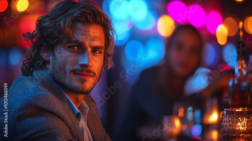 A man with wavy hair sits at a bar, illuminated by colorful lights, engaging with a woman.