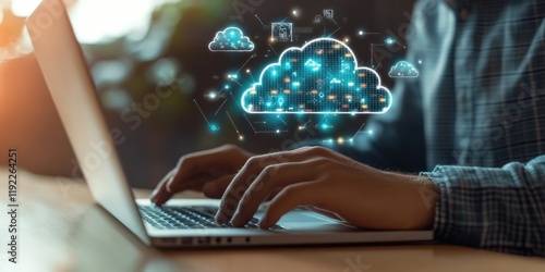 A man working on a laptop with a cloud computing diagram floating above his hand, representing cloud storage, internet services, and networking technology solutions.