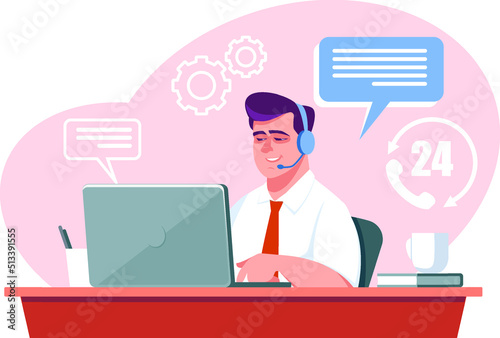 A man works in a call center. The concept of helping people over the phone and online. Stock vector illustration.
