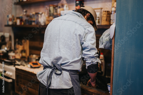 A man works in a rustic kitchen, preparing food wearing a denim jacket, apron, and a cap. The decor is warm and inviting, creating a homely and casual cooking ambiance.