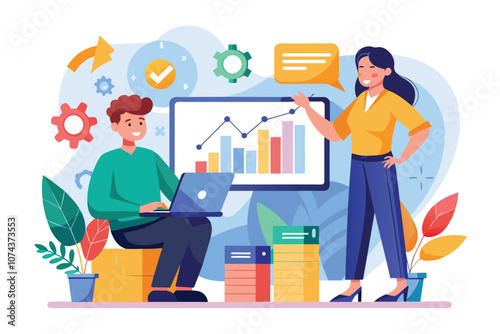 A man works on a laptop while a woman presents growth statistics using colorful charts in an office, Man and woman presenting work with company growth computer, flat illustration.