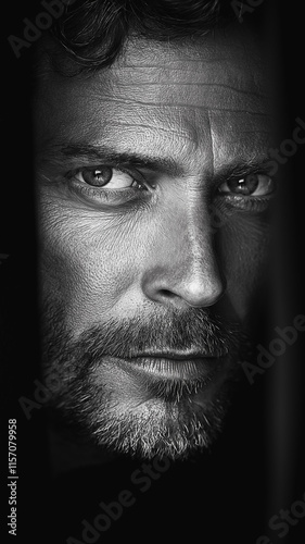 A man's face is shown in a black and white photo, with his eyes staring straight ahead. The photo has a moody and dramatic feel, as if the man is looking directly at the viewer