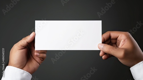 a man's hand holding a blank, simple white business card design mockup, the absence of text and the potential for business branding against a light background.