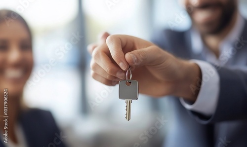 A man's hand holds out a key with a smiling woman in the background, symbolizing a new beginning, success, and achievement.