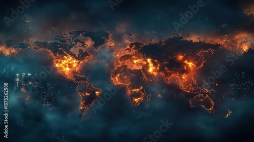A map of the world engulfed in flames, with cities glowing to represent business centers