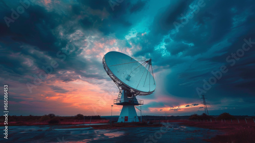 A massive satellite dish stands against a dramatic, cloudy sky during twilight.