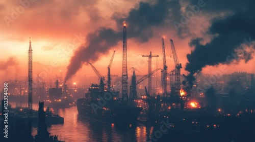 A massive shipyard factory with towering cranes, steel structures, and ship construction in progress