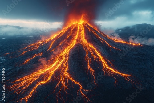 A massive volcano erupting lava, high-angle view, at dusk. Explosive Volcanic Eruption with Molten Lava Flow - Nature's Raw Power and Beauty