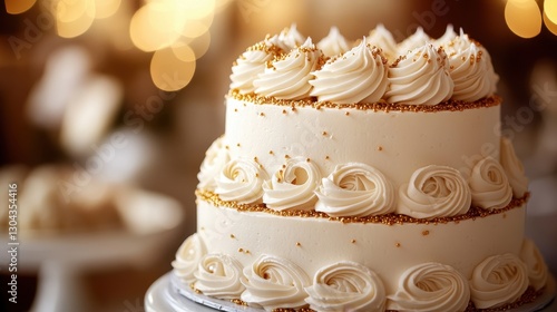 A masterpiece of confectionery, a tiered cake adorned with smooth, white whipped cream and a shower of shimmering gold sprinkles, its golden crown a testament to the baker is artistry.