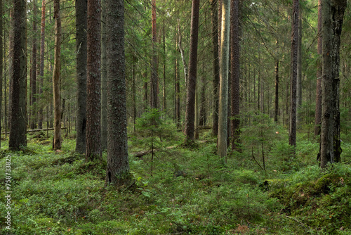 A mature coniferous natural forest on a late summer day in Estonia, Northern Europe
