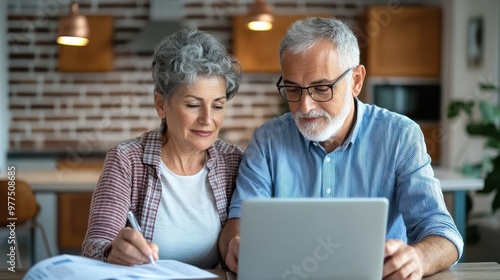 A mature couple sits closely at a kitchen table, reviewing paperwork together with a laptop open, showcasing teamwork and companionship in their warmly lit home.