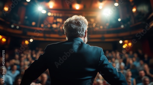 A mature man in a suit delivers a speech on stage in a theater, seen from behind with the audience in view, embodying authority and eloquence in communication.
