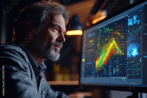 A mature man in front of a computer screen displaying climate data, reviewing weather patterns and forecasting upcoming weather events in a modern office setting.