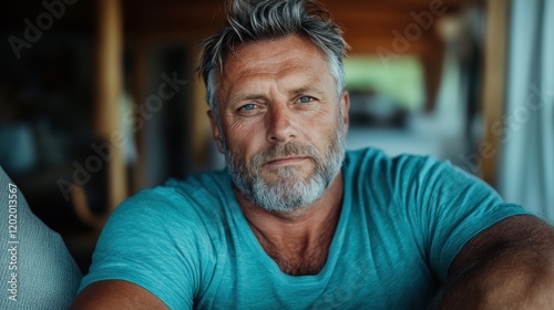A mature man with grey hair and a beard gazes thoughtfully, presenting a relaxed demeanor in a cozy indoor setting that evokes feelings of tranquility and reflection.